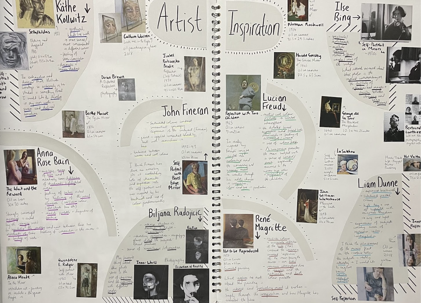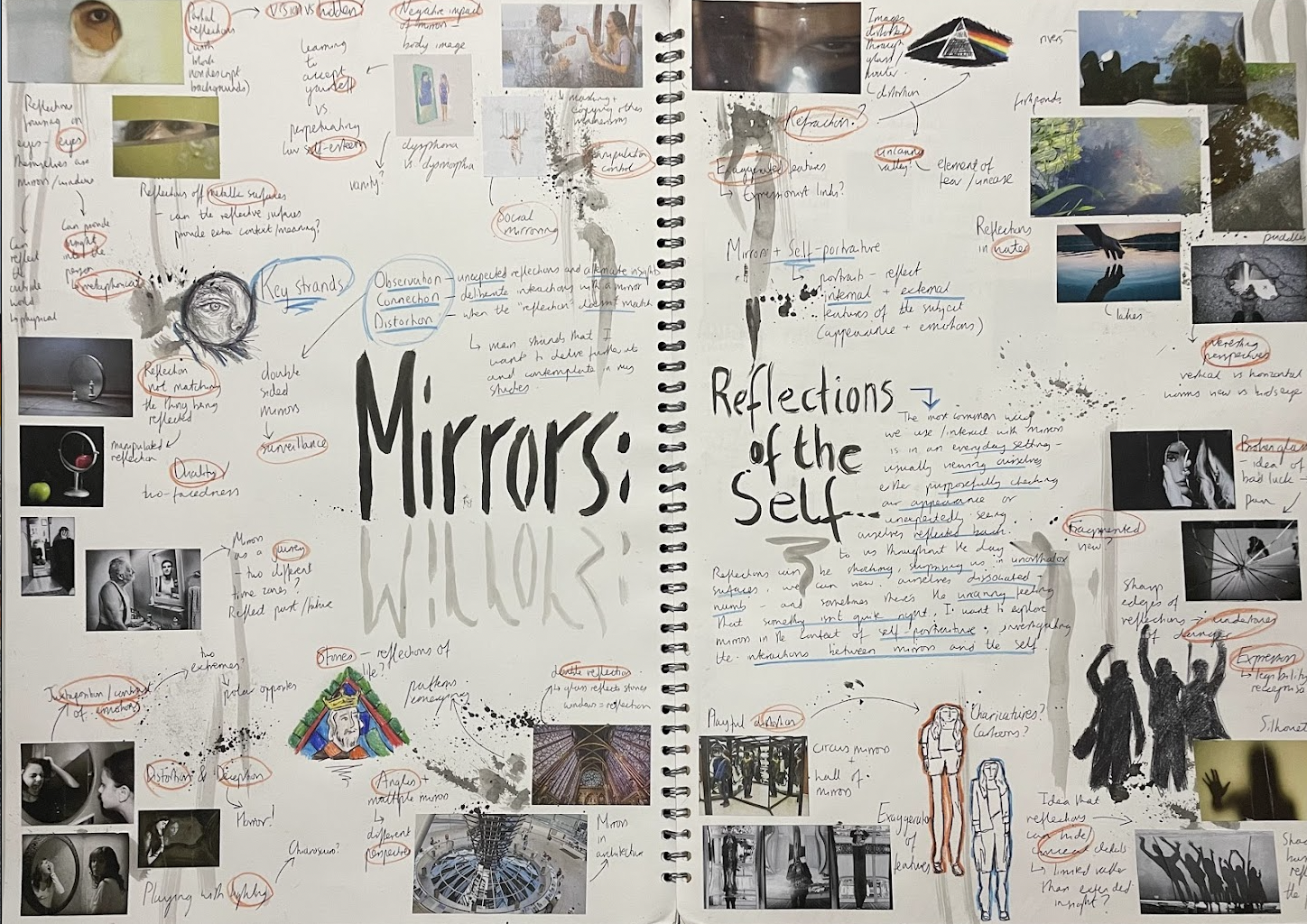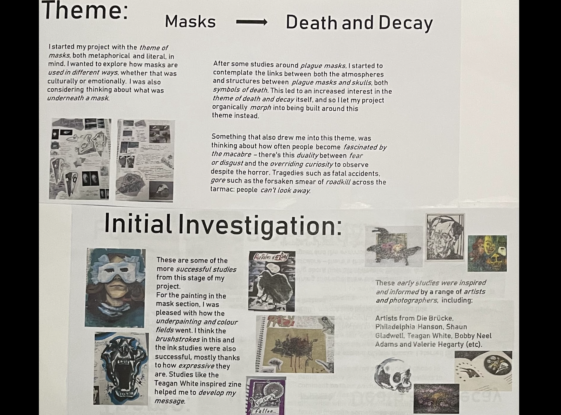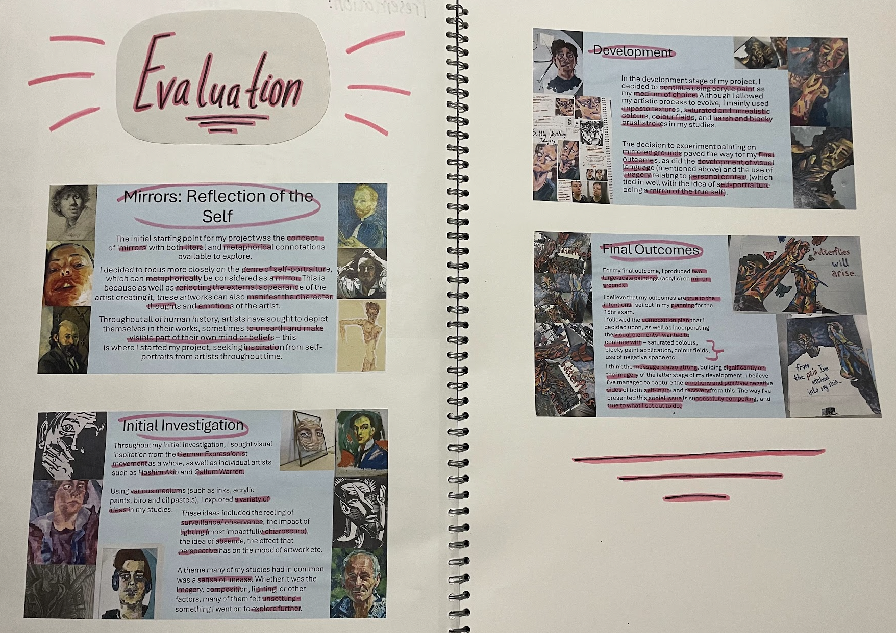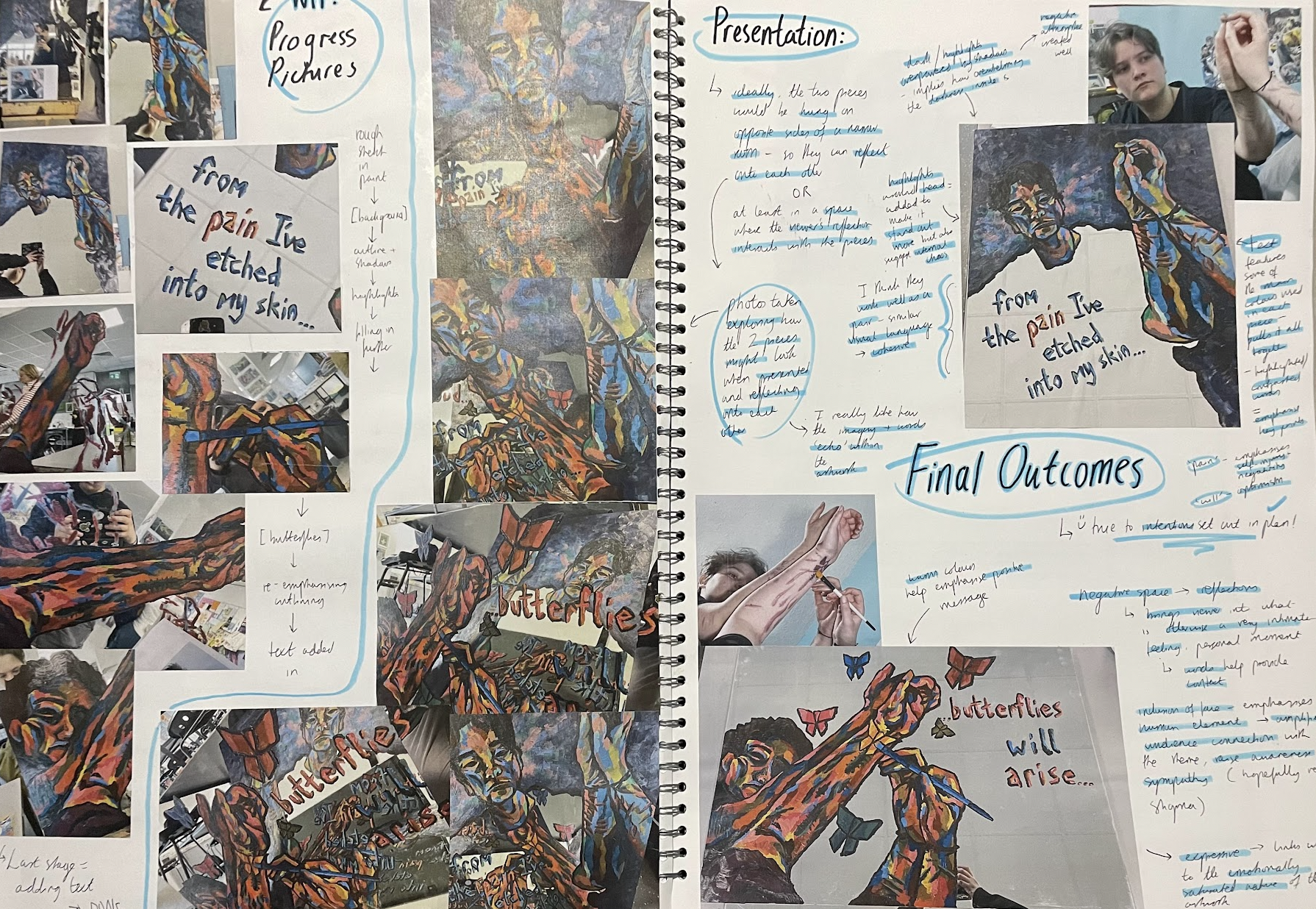A lot of my creative development took place during my Fine Art A Level course. After trialling lots of different mediums and artistic processes, this culminated in two main portfolios.